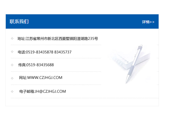 地址:常州市新北區友邦商務大廈1幢16、17層  電話:0519-85101652  傳真:0519-85112595  郵編:213022  網址:www.cz-jiayue_cn.yuefdc.com  郵箱:xiajifengaa@163.com